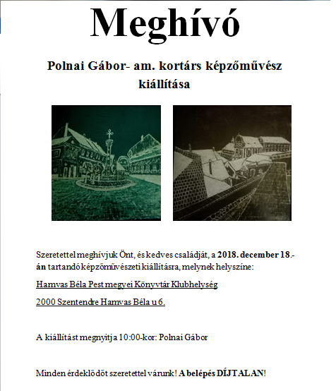 Polnai Gábor képzőművész január 21-én, hétfőn 10 órai kezdettel mutatja be a Hamvas Béla Pest Megyei Könyvtár klubtermében a szobrászati, festészeti és grafikai elemekből álló képzőművészeti újítását, a polmar technikát, melyre szeretettel várja az érdeklődőket.