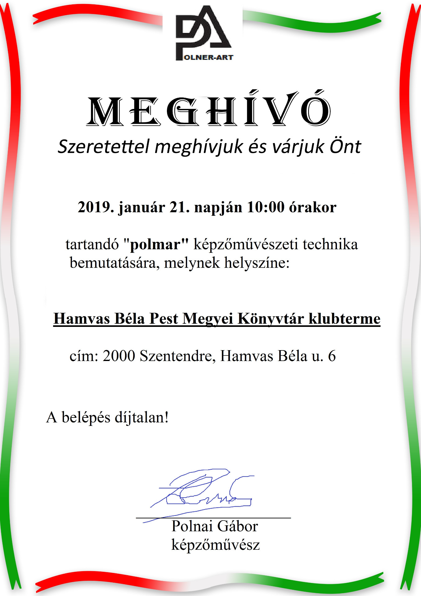 Szeretettel várok mindenkit a polmar képzőművészeti technika bemutatására a szentendrei PMK klubtermében 2019 január 21.-én 10:00 órai kezdettel.