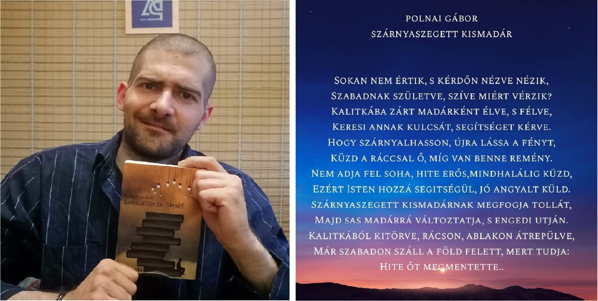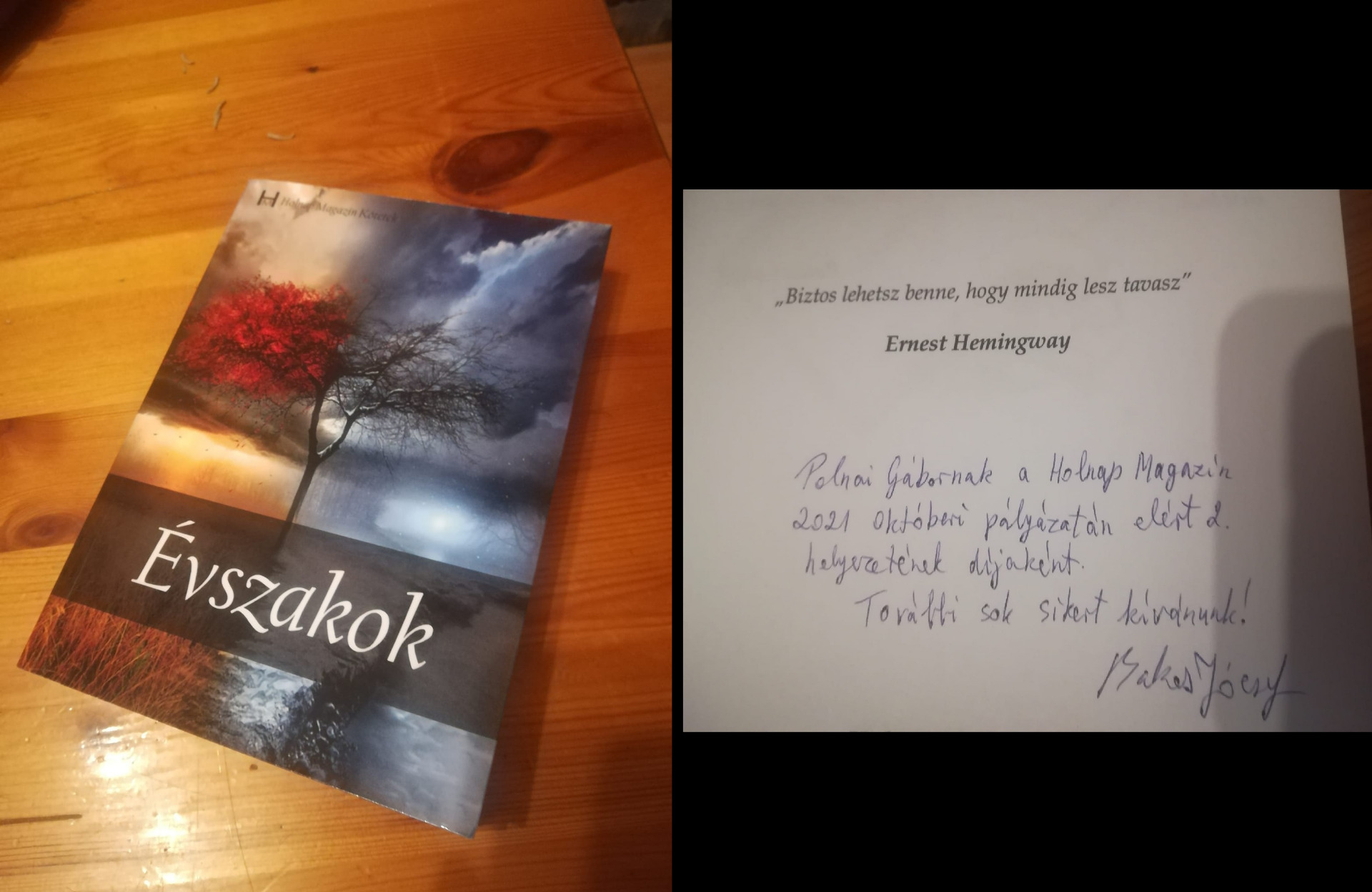 Örömmel értesültem arról, hogy a Holnap Magazin 2023 Júniusi "verselő versek" pályázatán a "Szárnyaszegett kismadár" c. versem lett az egyik nyertes, a zsűri döntése alapján. Külön megtiszteltetés, hogy a főszerkesztő, Bakos József író úr, saját könyvét kaphattam kézbe nyereményként.