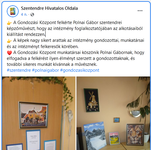 A Szentendrei Gondozási központ meghívását szívesen fogadva mutattam meg a tárlat keretein belül alkotásaimat, illetve beszéltem a művészet jótékony, gyógyító hatásáról is.