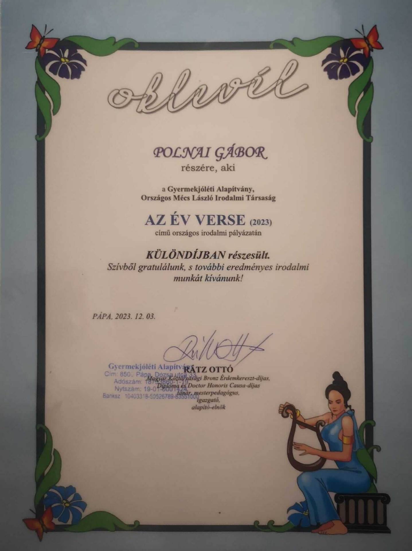 Örömmel tudatom, hogy isikerült megnyernem az "ÉV VERSE 2023" pályázat különdíját, mellyel megnyertem életem első ÖNÁLLÓ e-könyvét! Az ország legnagyobb e-Könyvtárában (Magyar Országos Széchenyi Könyvtár) lesz elérhető, 2024 február hónaptól. A könyvben megtekinthetőek lesznek verseim, írásaim, és festményeim is. A nyeremény mellé kaptam egy nagyon szép oklevelet is. Gratulálni szeretnék a többi díjazottnak, és köszönet a Gyermekjóléti Alapítványnak, valamint az OMLIT-nak a pályázat lebonyolításáért.