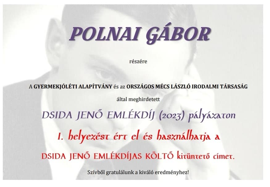 Osztozni szeretnék örömömben, hogy elnyertem a nemzetközi Dsida Jenő emlékdíj pályázat első helyét!